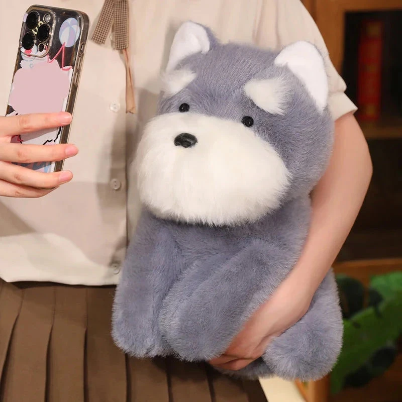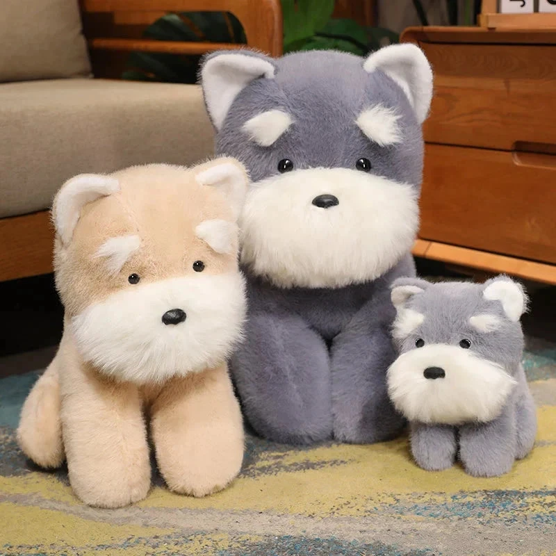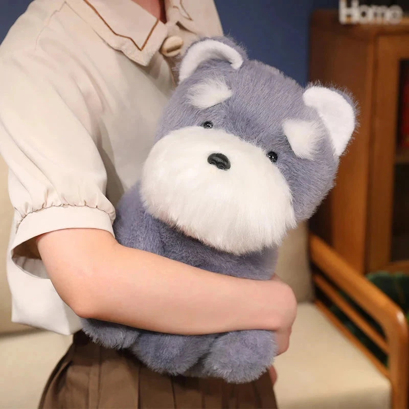 Cuddle up with our irresistibly soft dog plushies! These cute and fluffy pups are the perfect companions for when you need some comfort or a quiet snuggle. Made from ultra-soft fabric and filled with 100% PP cotton featuring a beige and gray schnauzer dog plush sitting up, these plushies are sure to brighten your day.