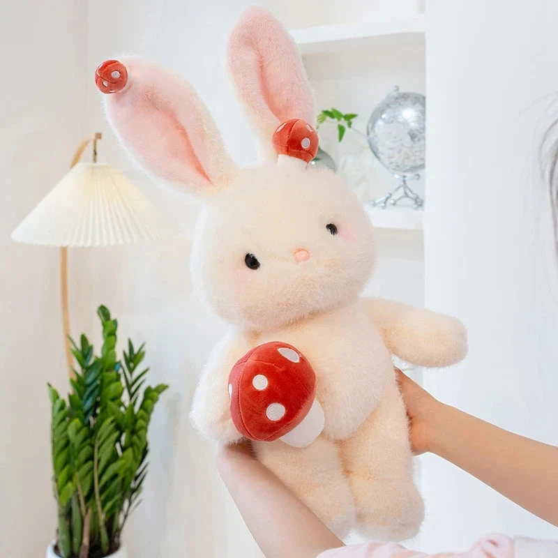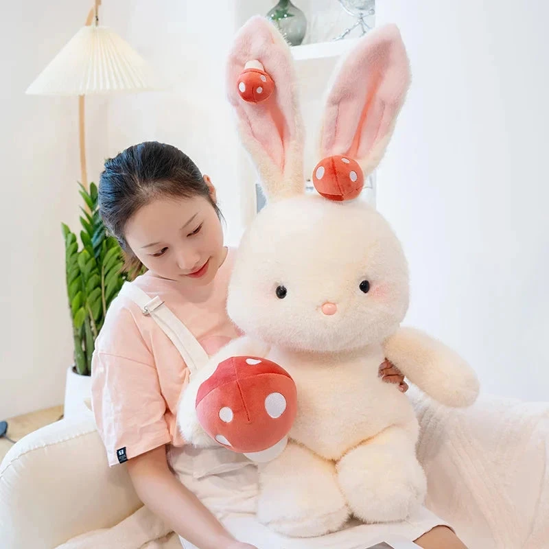 Meet the cutest Bunny Plushie ever, your new kawaii companion here to sprinkle your life with cuteness and joy! With its fluffy white faux fur and bright pink cheeks and covered with adorable mushroom plushies, this bunny is irresistibly soft.