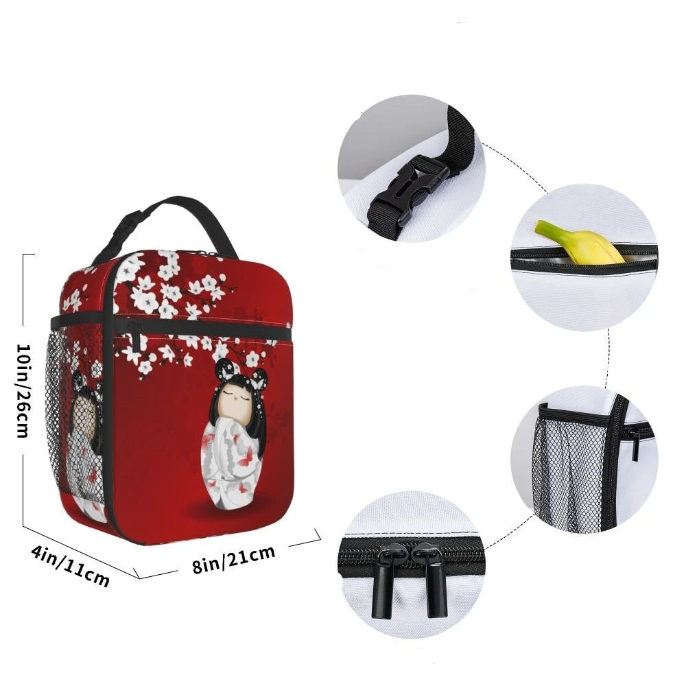 Relive the beauty of Japan with this Sakura-inspired lunch bag. It has a spacious interior that can fit a lunch box, snacks, fruit, beverage, and more. Plus, it keeps your food fresh and tasty for hours, thanks to its insulated lining. This lunch bag is perfect for anyone who loves Kokeshi dolls and cherry blossoms.