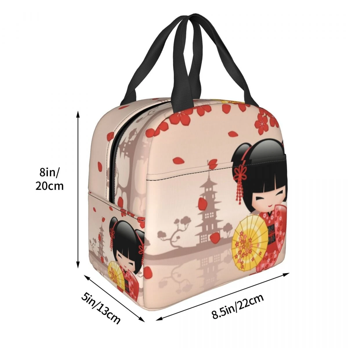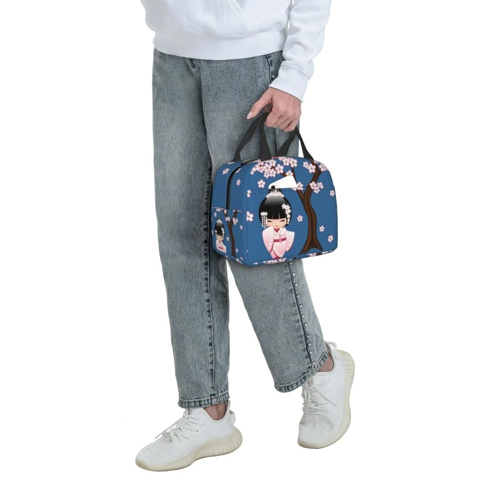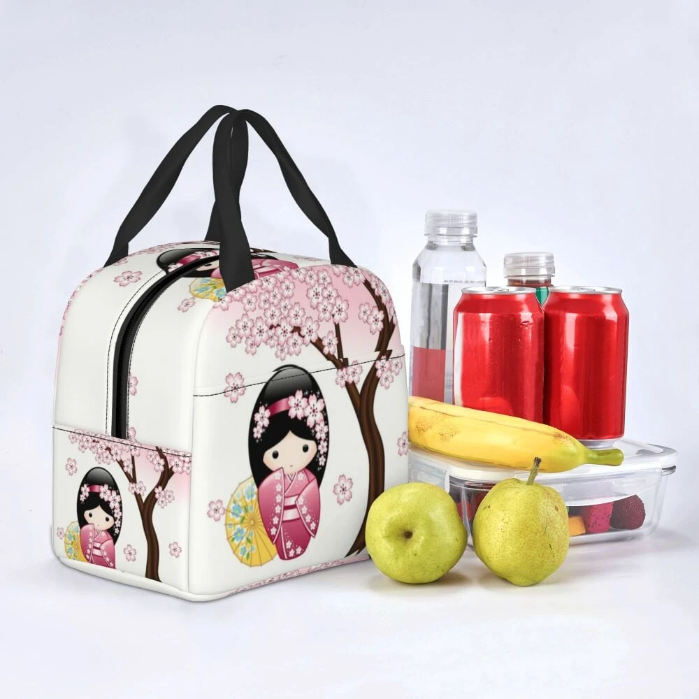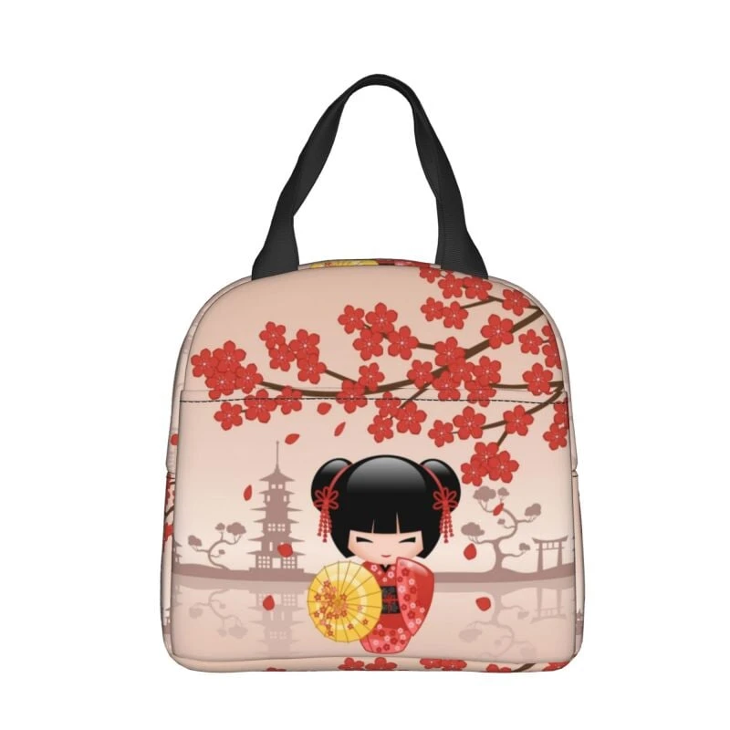 Experience the charm of Japan with this Sakura-themed lunch bag. It features a cute Kokeshi doll design and a lovely cherry blossom pattern. The lunch bag has enough room to store your lunch box, drinks, fruits, snacks, and more. It also has an insulated lining that keeps your food fresh and delicious for hours. This lunch bag is ideal for anyone who adores Kokeshi dolls and Sakura flowers.