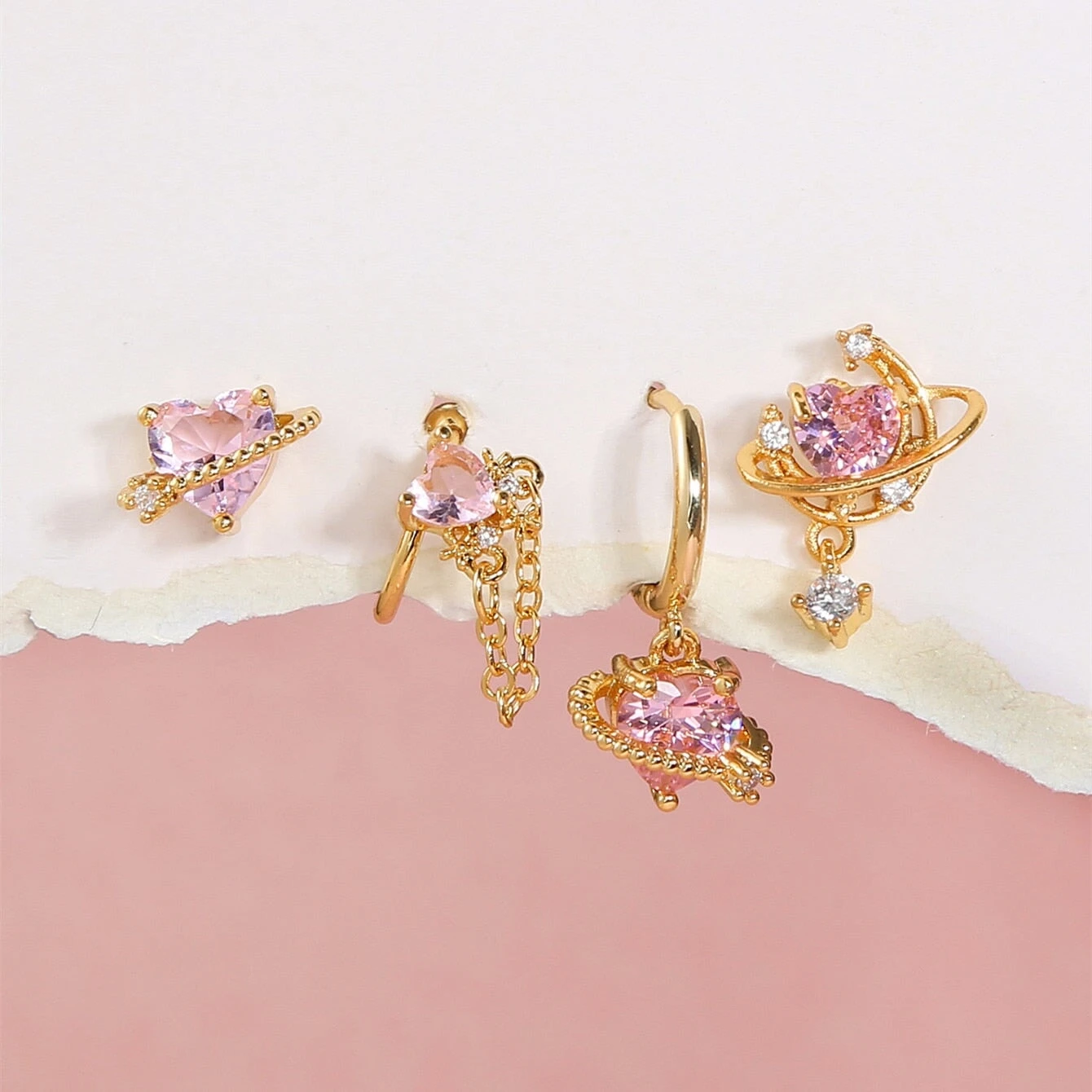 A symbol of love and beauty to add a glimmer to your outfit. These heart-themed earring sets are made from copper and 18K real gold plating. With a light pink/purple stone at the center and small details, this is a set to add to your earring collection.