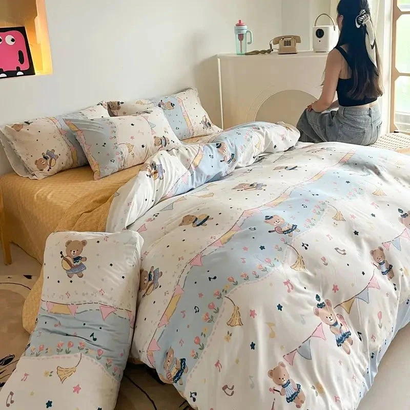 Featuring adorable bear-themed designs that adds warmth and character to any bedroom. This cozy bedding set includes a beautifully printed duvet cover, matching pillowcases, and a coordinating bed sheet for a complete and stylish look. Perfect for kids, teens, or anyone who loves a touch of vintage charm, this bedding set effortlessly blends comfort and cuteness.